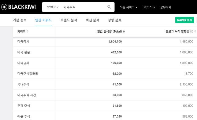 블랙 키위에 접속했다면 우선 자신의 블로그의 주제에 맞는 기본 키워드부터 알아봅니다. 제가 운영 중인 미국주식 관련 블로그를 예로 들어 보겠습니다. 블랙 키위 검색창에 블로그 주제인 미국주식을 입력해 보겠습니다.