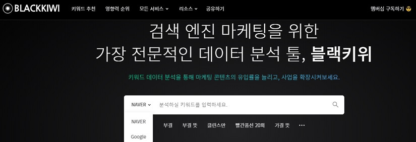 블랙 키위에서는 네이버와 구글의 검색 키워드를 알아볼 수 있는데요, 구글에서의 키워드를 알아보려면 유료로 가입을 해야 됩니다.