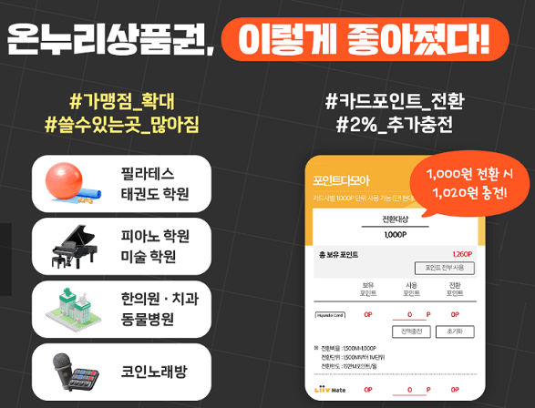 - 안 쓰는 카드포인트를 전환하여 사용할 수 있어요. 전환 금액의 2% 추가 적립!