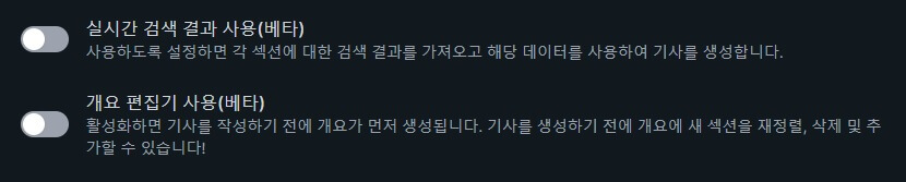 개요 편집기 사용을 활성화하면 기사를 작성하기 전에 개요가 먼저 생성되며, 기사를 생성하기 전에 개요 섹션들을 재정렬, 삭제 및 추가할 수 있습니다.