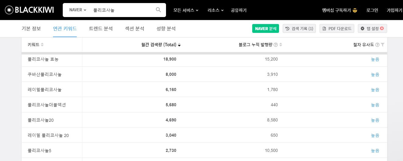 블랙키위에서 관련 키워드 선위와 검색량 알아보기
