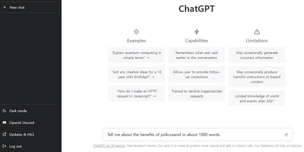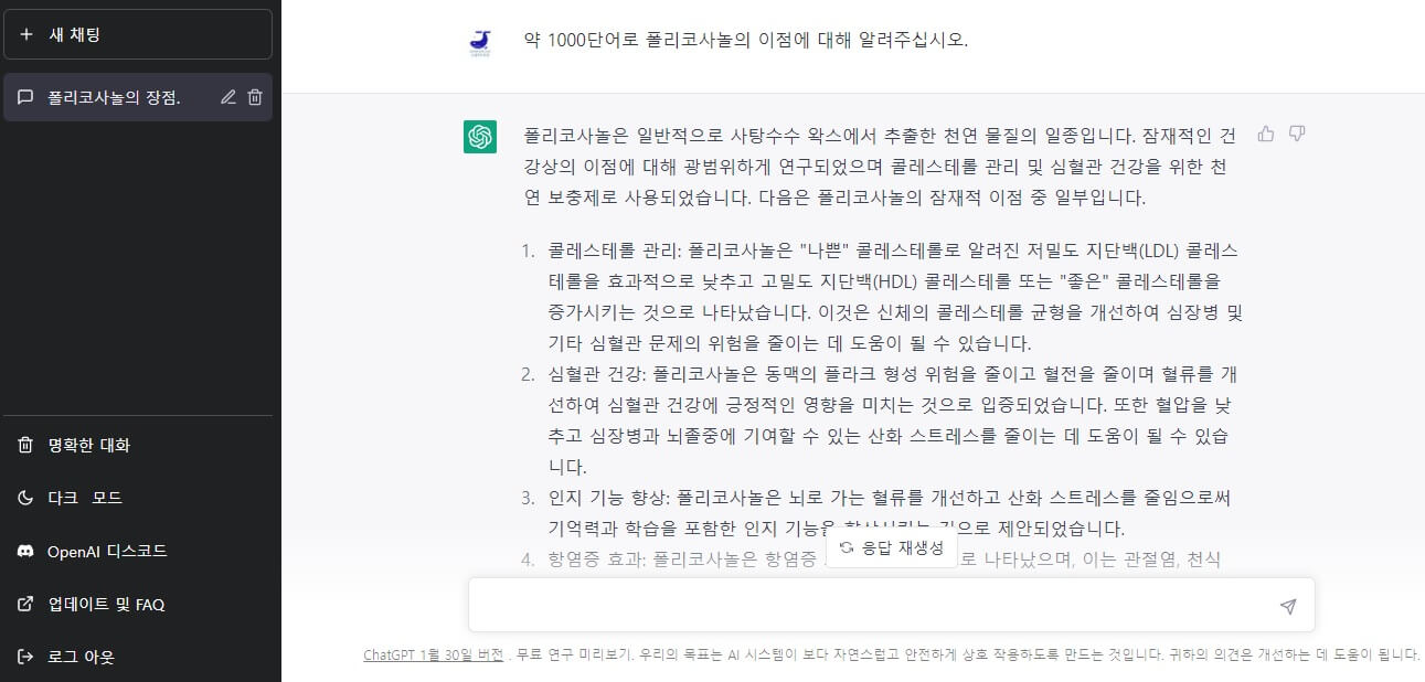 폴리코사놀 효능에 관해 1천자 정도의 분량으로 알려달라는 요청을 영어로 번역해 이를 복사한 뒤 챗GPT 프롬프트에 붙여넣기를 하고 엔터를 누릅니다.