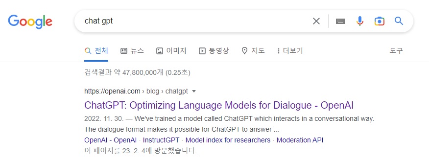 구글에서 챗GPT를 검색하면 이와 같이 챗GPT 홈페이지가 나옵니다.