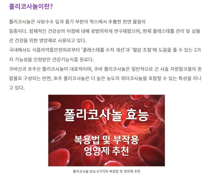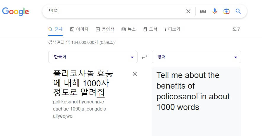 폴리코사놀 영양제에 관한 블로그 글을 쓰기 위해 구글 번역기에 우선 폴리코사놀과 관련해 검색양이 가장 많은 폴리코사놀의 효능에 관한 요청을 합니다.