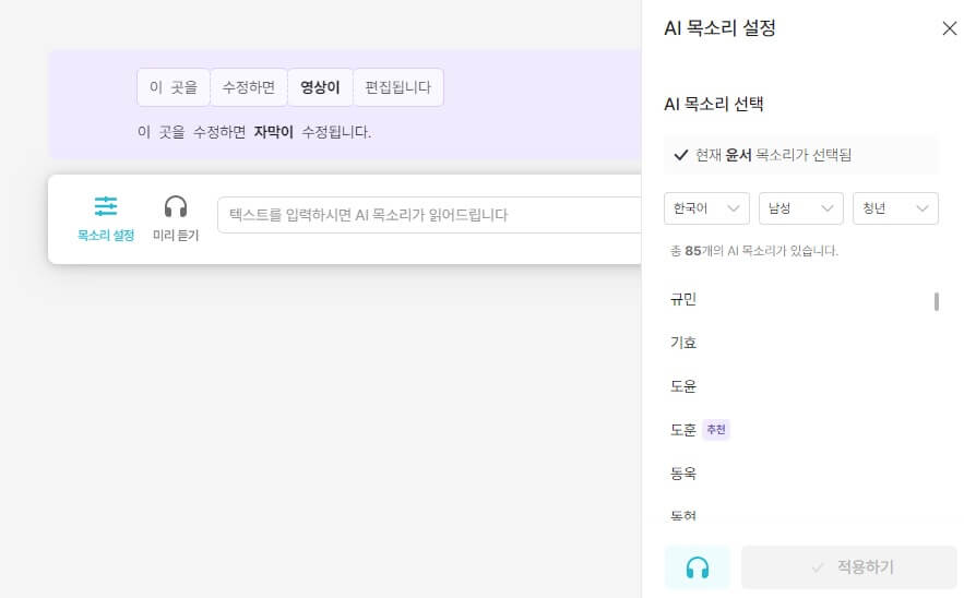 목소리 설정을 클릭하면 한국어를 비롯해 영어와 일본어 등의 언어를 선택할 수 있으며 남성 또는 여성 그리고 어린이, 청소년, 청년, 중년, 어르신 등 다양한 연령대의 AI 목소리를 들어보고 선택할 수 있습니다.