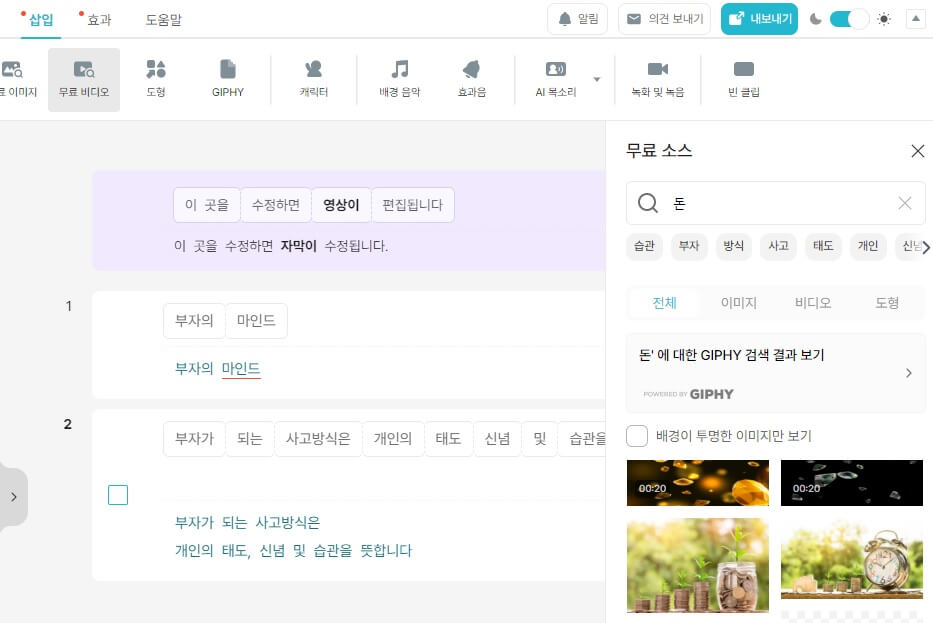 이렇게 모든 작업을 거쳐 완성이 되면 파일 메뉴에서 영상으로 내보내기를 선택해 제작한 영상을 다운로드 받으면 됩니다.