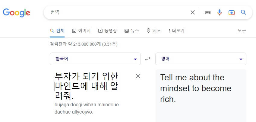 구글 번역을 통해 부자가 되기 위한 마인드에 대해 알려달라는 내용을 영문으로 요청하자 챗GPT가 간략한 내용의 답을 해줬습니다.