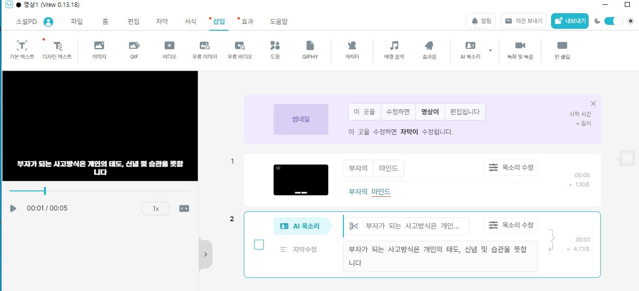 콘텐츠에서 가장 중요한 건 내용이니 이렇게 자막과 음성 작업을 마치게 되면 70% 정도는 완성된 셈입니다.