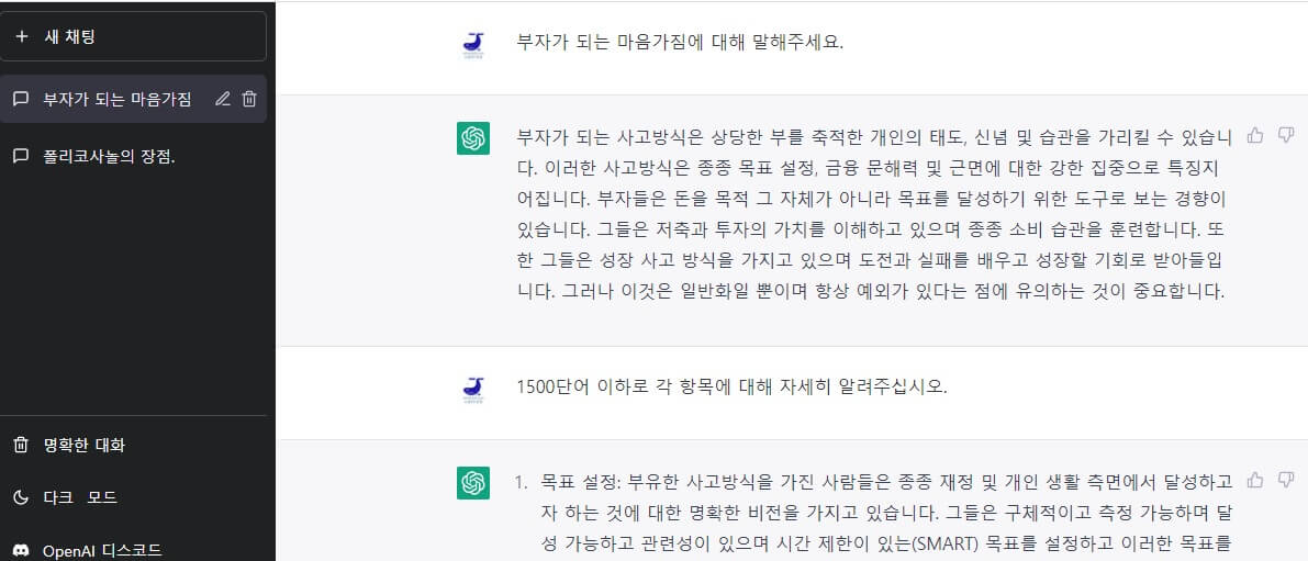 예시로 일종의 동기부여 영상을 만들기 위해 챗GPT에서 부자가 되기 위해 가져야 할 마인드에 대한 텍스트를 생성해보겠습니다.
