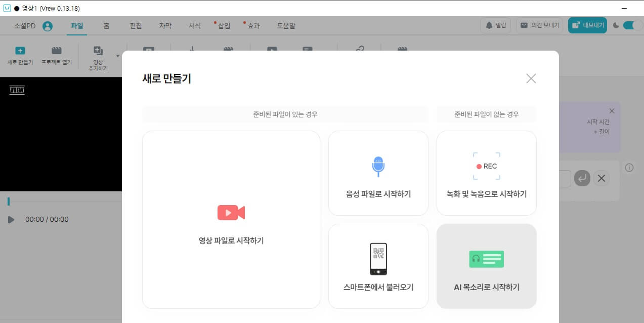 좌측 상단의 메뉴 중 파일에서 새로 만들기를 클릭하면 창이 뜨는데요. 이 중에서 ‘AI 목소리로 시작하기’를 선택합니다.