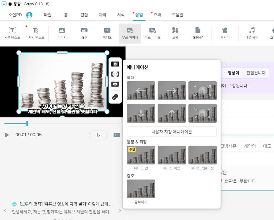 또한 삽입 메뉴에서는 배경음악과 효과음, 캐릭터 등도 선택해 넣을 수 있습니다.