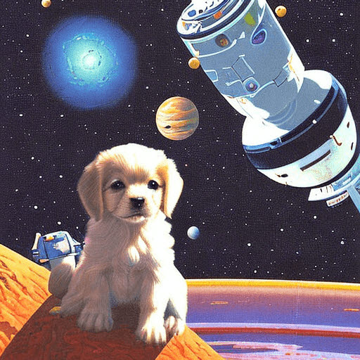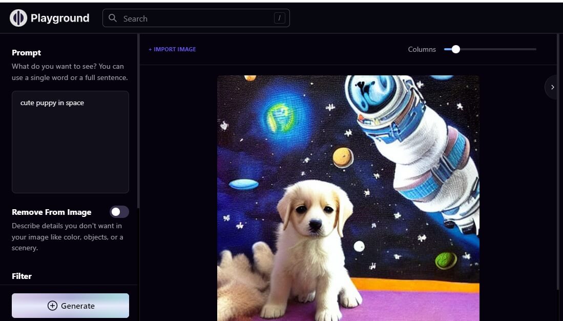 프롬프트에 ‘우주에 있는 귀여운 강아지(Cute puppy in space)’라는 요청을 입력한 뒤 좌측 하단의 제너레이트를 클릭하면 이처럼 관련된 이미지를 생성해줍니다.
